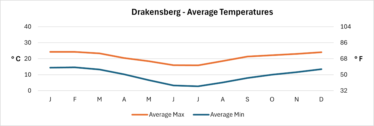 The best time to visit depends on what activities you wish to do and the sights you hope to see. Springtime in the Drakensberg amphitheatre is filled with contrasting colours of flowers and day-time temperatures that sit between 12 - 20°C (53 – 68°F), making hiking this region a pleasurable and memorable experience. The wet summer season in the Drakensberg, sees hot and humid days, with average temperatures sitting in the high 20 °C (70°F), with the occasional late afternoon thundershower cooling the landscape down. The plant and birdlife tend to thrive during this time of year as flocks of Drakensberg Rockjumpers, Drakensberg Siskins, Cape Parrots and the rare Blue Swallows can be seen throughout. The months of autumn (April-May) are optimal for higher and longer hikes, as conditions are comfortable, and views are extraordinary. Winter in the Drakensberg Mountains means extreme weather conditions with temperatures that range between 9°C (48°F) during the day, to -3°C (26°F) overnight. Snow is likely to fall on some of the higher peaks during these months, however, the cool dry air and lack of rain will unlikely hinder any outdoor activities as it is the driest season of the year.