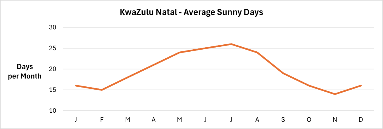 During the midst of summer, average day-time temperatures range between 29 – 30°C (84 – 86°F) with the presence of afternoon thunderstorms often offering a cool relief to families who flock to the east coast for their annual festive vacation. The drier winter months on the KwaZulu-Natal coastline are not as busy, but are perfect for swimming and surfing, as the warm Agulhas current ensures that the waters in this region stay swimmable for most months of the year.