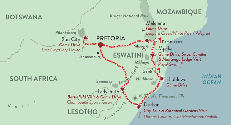 As of 2024 this spectacular 14-night African Trilogy journey will take you through South Africa, Eswatini, and Namibia. Beginning in Pretoria you will journey to the Kruger National Park, south through Eswatini, and further south to Durban, after which your journey traverses west through South Africa and up into Namibia. Excursions on this journey will take you on Big 5 game drives, historical city tours, and overnight stays at luxurious lodges in Sossusvlei and Etosha National Park before winding back through the vast Namib Desert to Walvis Bay where this African Trilogy journey will end.